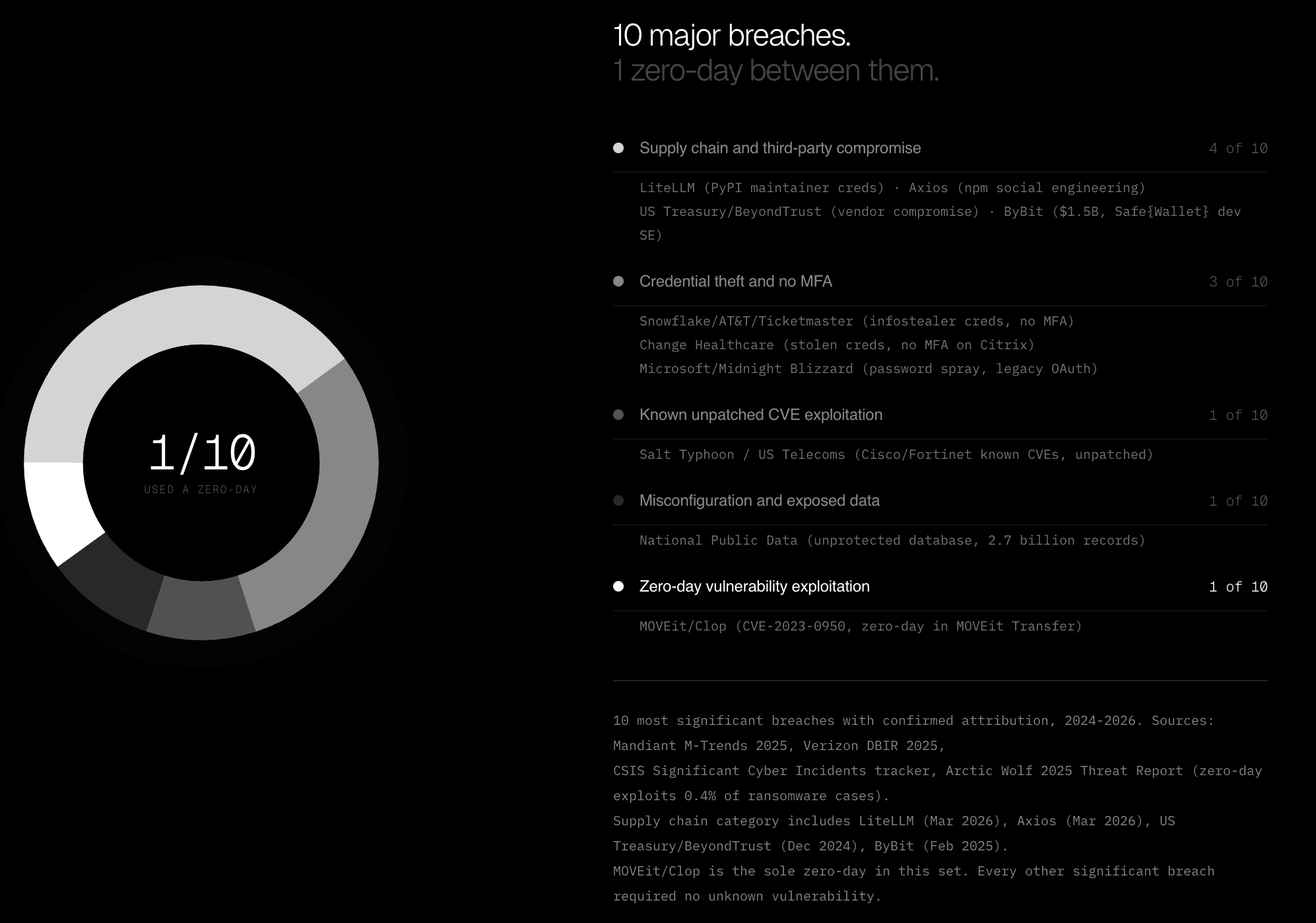 Rather than pointing to our own engagement data in isolation, consider the ten most significant breaches of the last two years where attribution is confirmed and the initial access vector is publicly documented - household names, billions of records exposed, combined financial impact in the hundreds of billions of dollars, and a grand total of one zero-day between all of them.