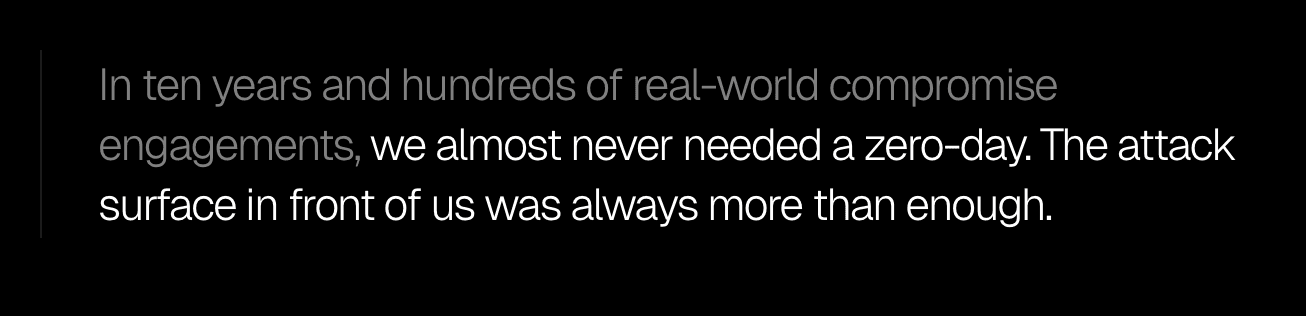 In those ten years, across hundreds of engagements, the number of times we needed a zero-day vulnerability to achieve our objective was vanishingly small - and in every case where one was available, the same objective could have been reached through the misconfiguration, the credential, or the unpatched known CVE sitting right next to it. Zero-days exist and matter, but they are not what is driving the overwhelming majority of real-world compromise.