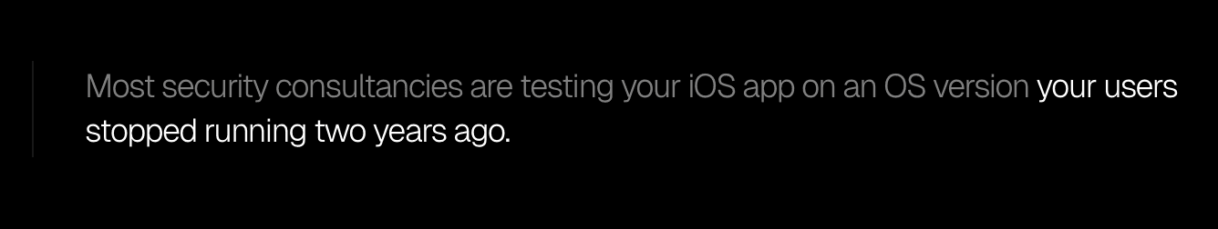 The handful of organisations that have done this seriously - companies like Corellium, who built a virtualisation platform purpose-built for iOS security research - have spent years and significant capital getting there. For the average security consultancy, maintaining that kind of in-house iOS lab infrastructure is simply not economically viable. So they test on what they have, and what they have is increasingly not representative of what your users are running.