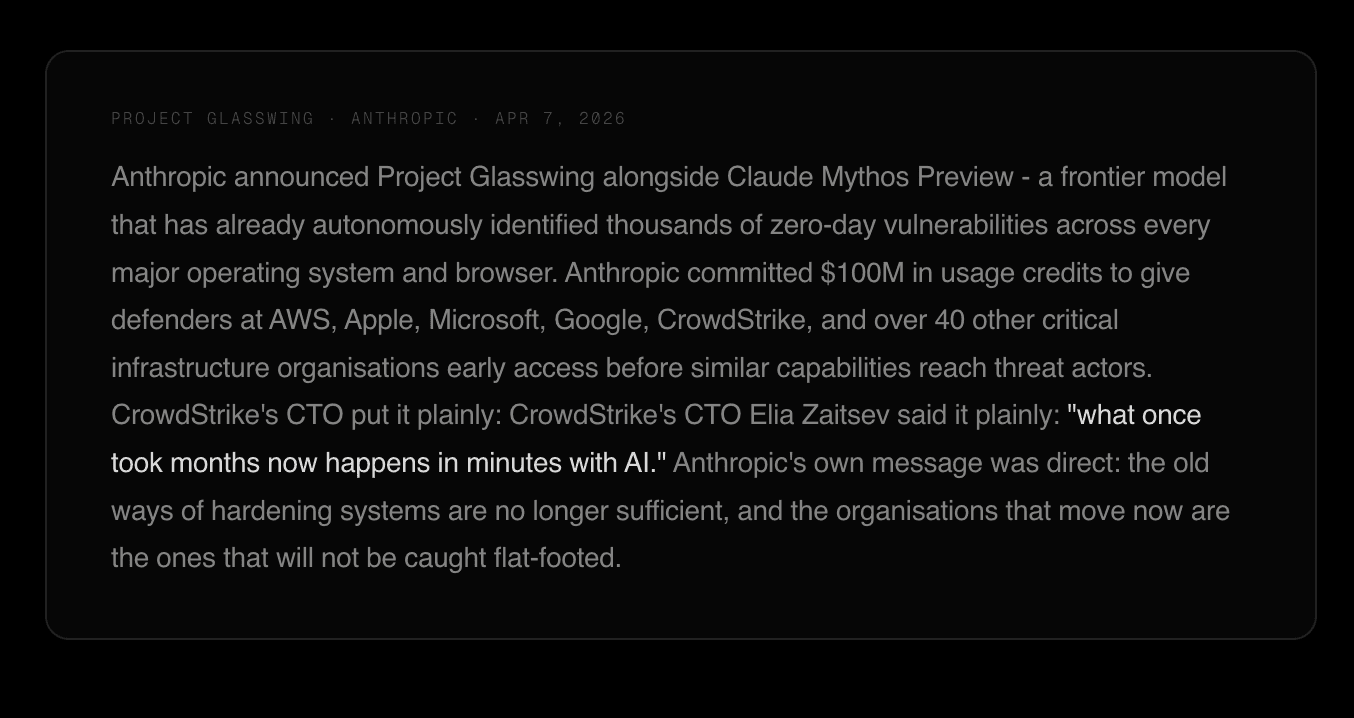 Yesterday, Anthropic announced Project Glasswing and the Claude Mythos Preview model - a frontier AI system that the company describes as currently far ahead of any other model in cyber capabilities, and which has already autonomously identified thousands of zero-day vulnerabilities across every major operating system and browser, including a 17-year-old remote code execution vulnerability in FreeBSD that had gone undetected since before most current developers started their careers.