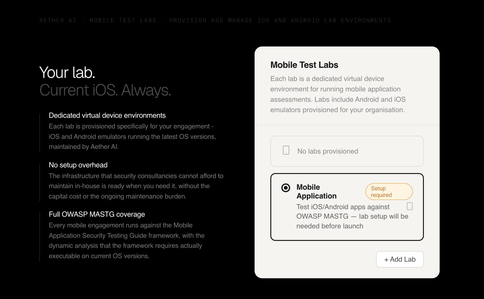 Our mobile labs are our contribution to the same problem, at the engagement level, for organisations that need to know right now whether the mobile applications they are running can withstand the kind of iOS-level attack that AI systems can increasingly construct and execute.
