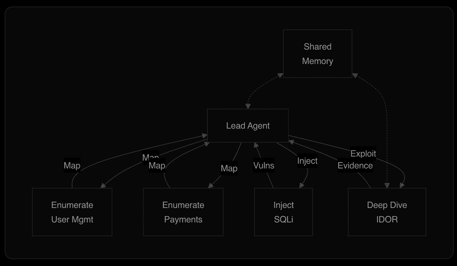 The agent layer runs as a coordinated team. A lead agent manages strategy. Enumerate agents map functional areas in parallel. Deep-dive agents take a specific finding and fully exploit it. Injection specialists handle systematic payload delivery. All share unified memory.