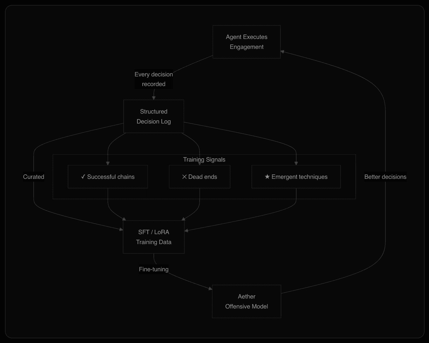 Aether AI is built differently - a closed-loop system where every component feeds every other component. Attack surface discovery informs penetration testing, penetration testing produces findings that refine attack surface understanding, and every decision the AI makes during an engagement is recorded, curated, and fed back into the offensive model through supervised fine-tuning. The system metabolises engagements.