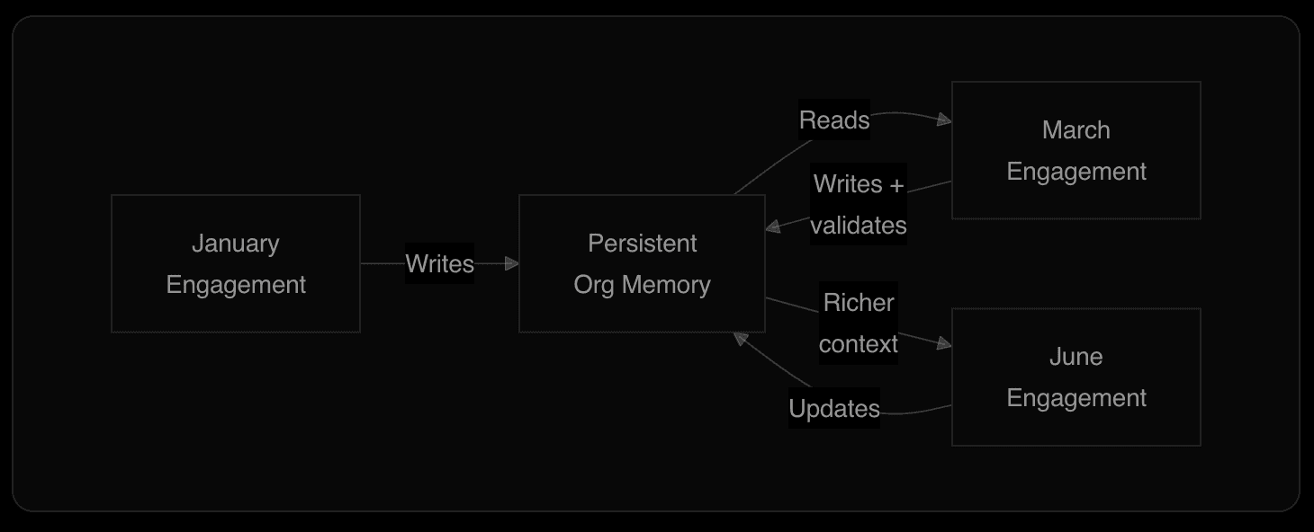 Compound effect: Every engagement deposits knowledge. Every future engagement withdraws it. Understanding deepens without human curation.