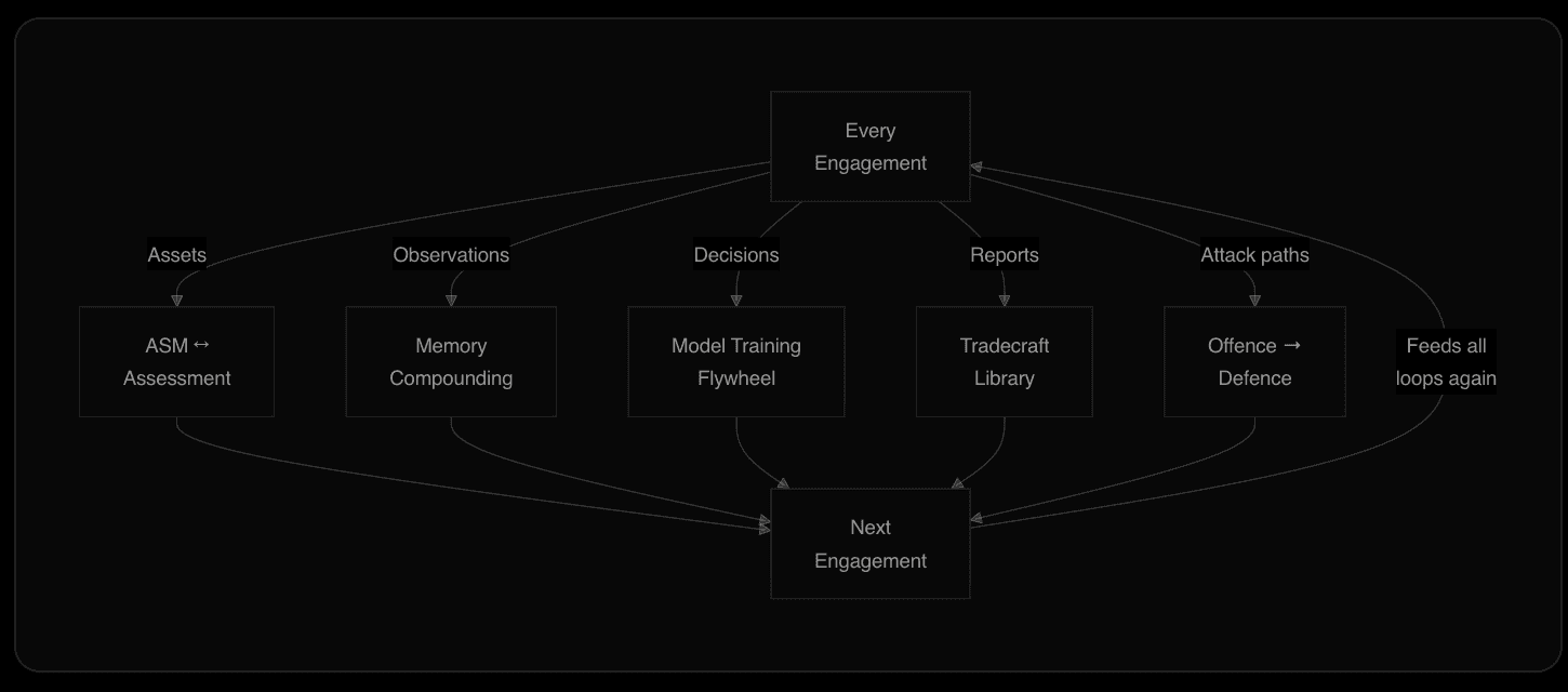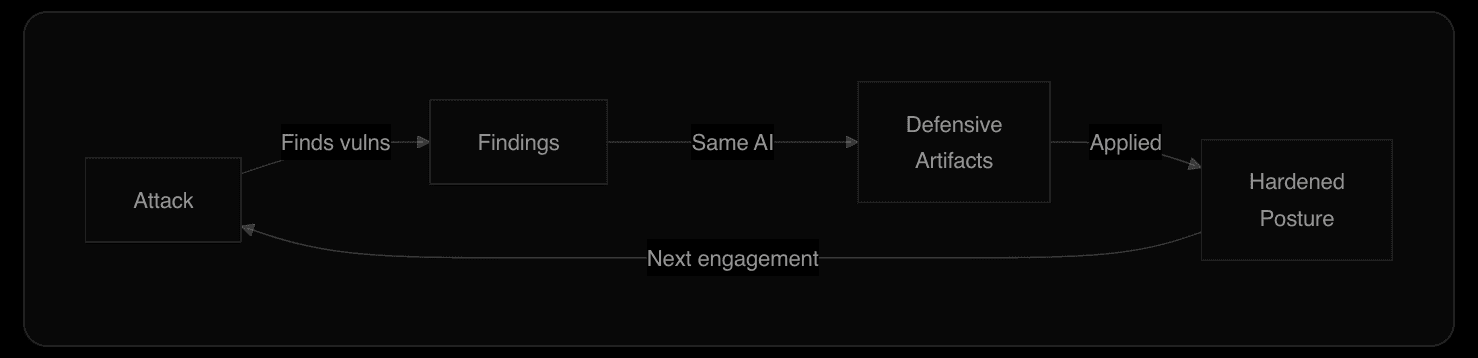 Compound effect: The next engagement tests the hardened posture and finds the gaps that remain. The attacker and defender are the same AI.
