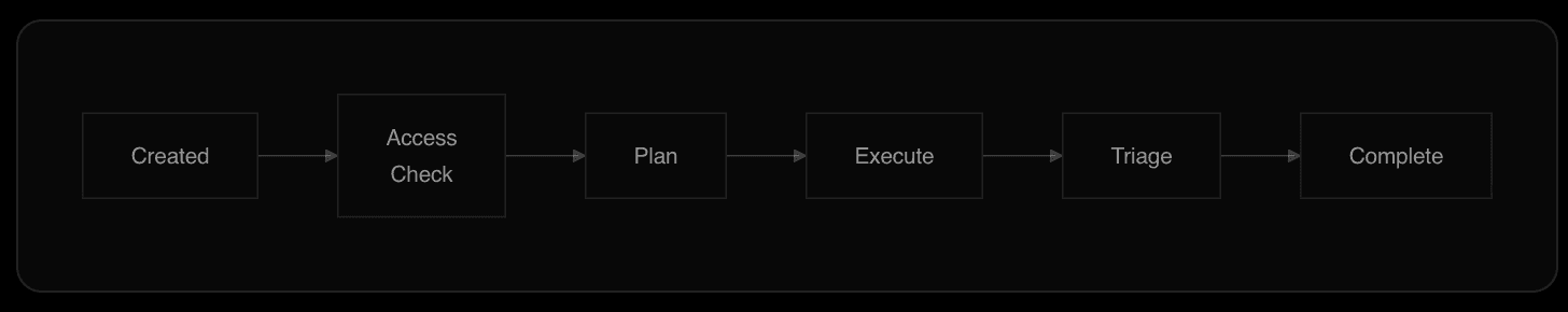 The assessment pipeline follows an event-driven state machine. Each transition is automatic - no human touches the pipeline unless they choose to.