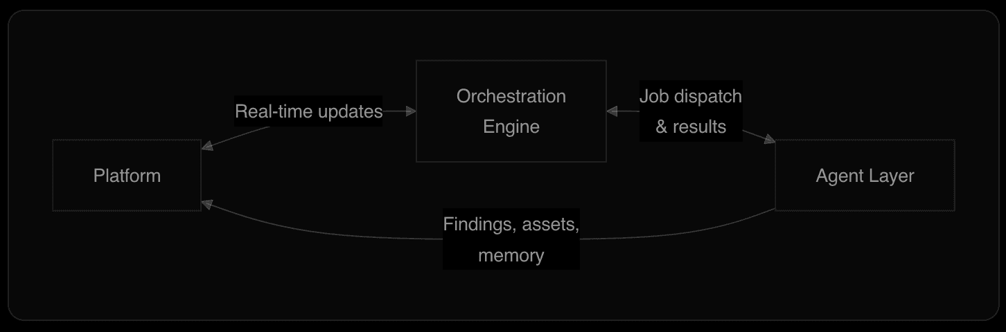 The platform manages projects, attack surface inventory, findings, and the conversational AI interface where customers interact with the same intelligence that ran their engagement. The orchestration engine drives the assessment lifecycle and coordinates multiple agents working in parallel. The agent layer is where attacks execute: a multi-agent system on dedicated offensive infrastructure with specialised tool servers and a three-model intelligence core.
