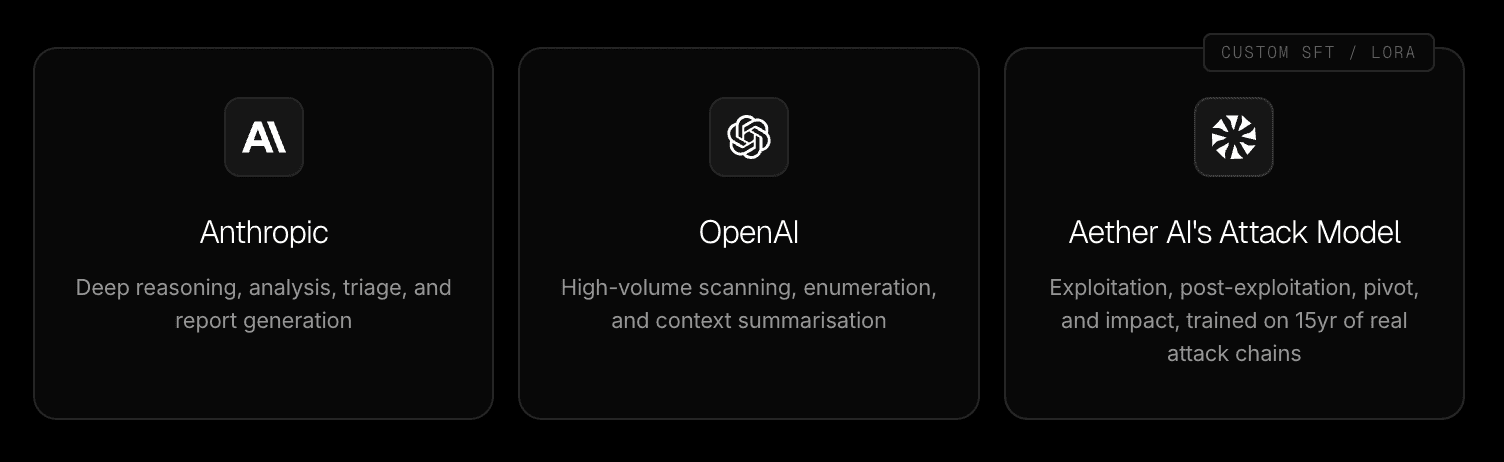Aether AI runs a three-model architecture: two frontier models for general intelligence and reasoning, and a custom offensive model we built and continuously train for the tasks frontier models refuse or fail at.