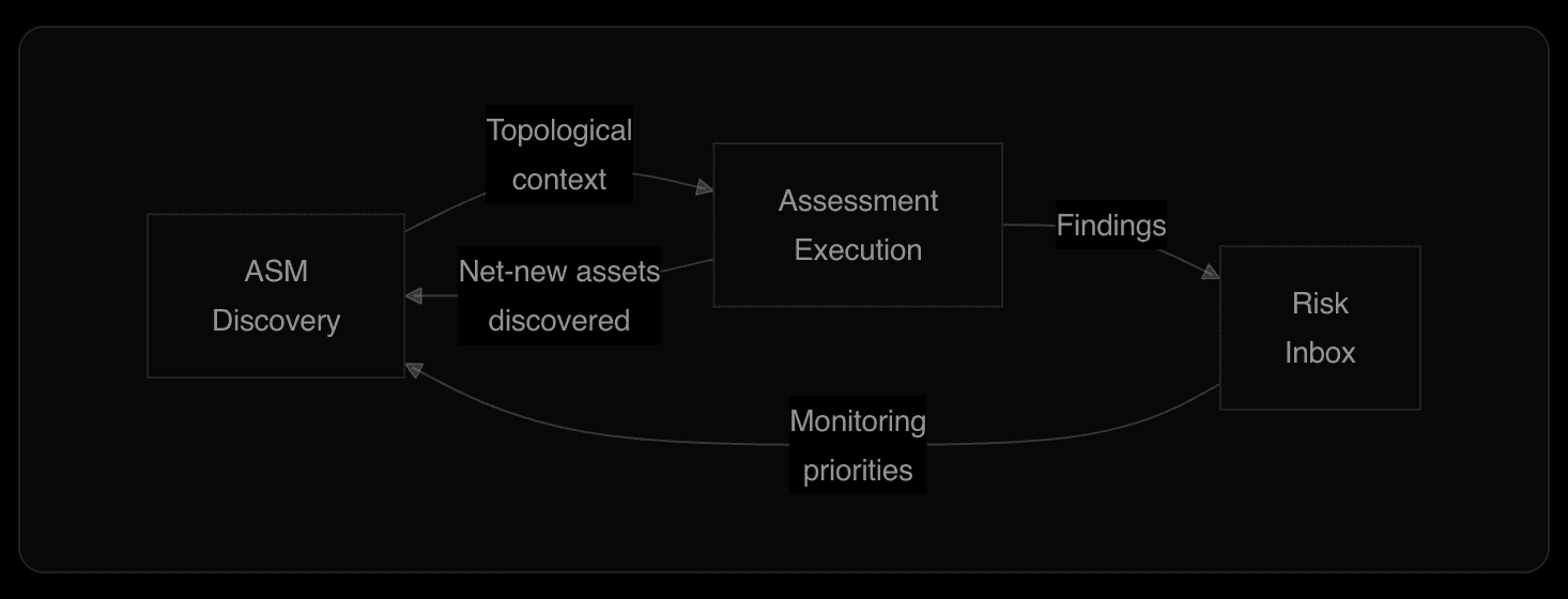 During execution, the agent discovers things ASM did not. Internal API endpoints exposed in JavaScript bundles. IP addresses not in the cloud inventory. Credentials that unlock access to systems ASM had no visibility into. Every discovery flows back into the attack surface in real time.