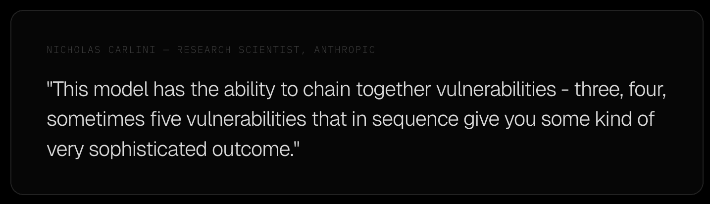 Nicholas Carlini, Research Scientist at Anthropic, described what sets Mythos apart from every prior AI vulnerability research system as the ability to chain vulnerabilities together - three, four, sometimes five in sequence - to achieve outcomes that no individual finding would produce in isolation.