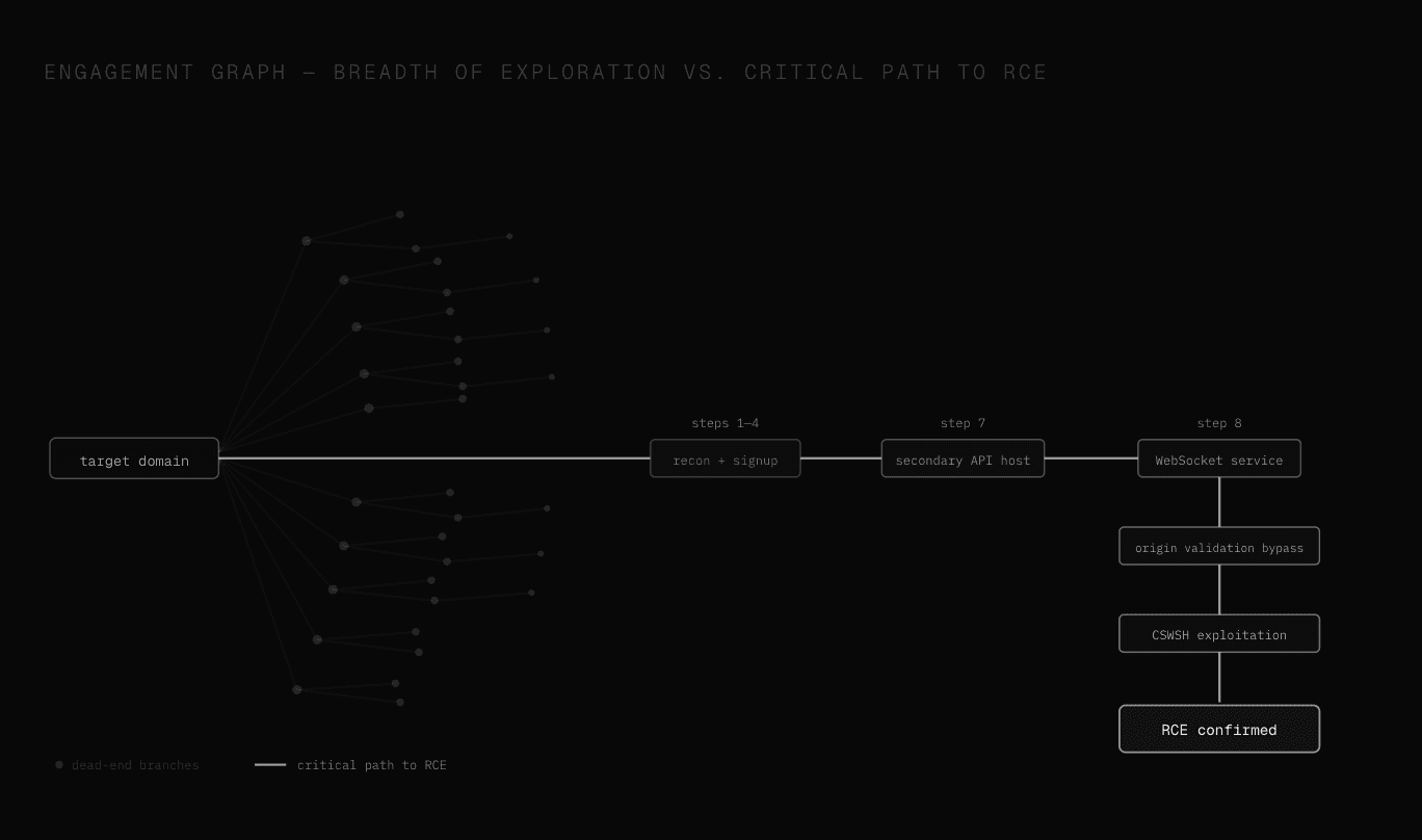 The finding that made RCE possible was not a high or a critical - it was a missing origin validation check on a WebSocket endpoint that nobody had thought to test, discovered only because the agents had spent hours mapping an application surface that included a secondary API host that the target did not know the engagement would reach. That is what chains look like when an AI system holds the full context of an engagement and reasons across it continuously.