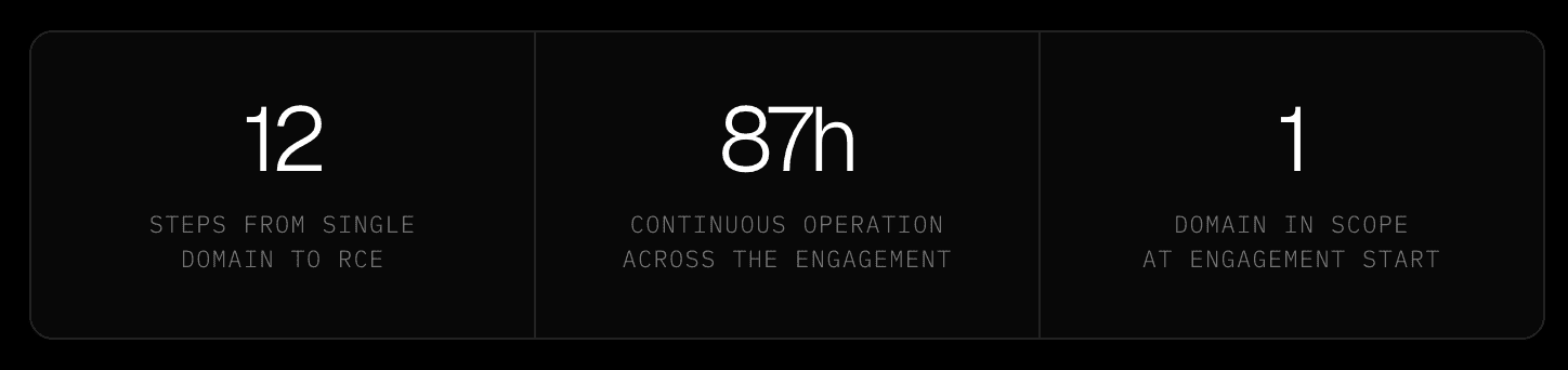 Aether AI ran against a target AI startup for 87 hours and 11 seconds. From a single domain, across 12 steps, the swarm reached full remote code execution where every step was built on the last.
