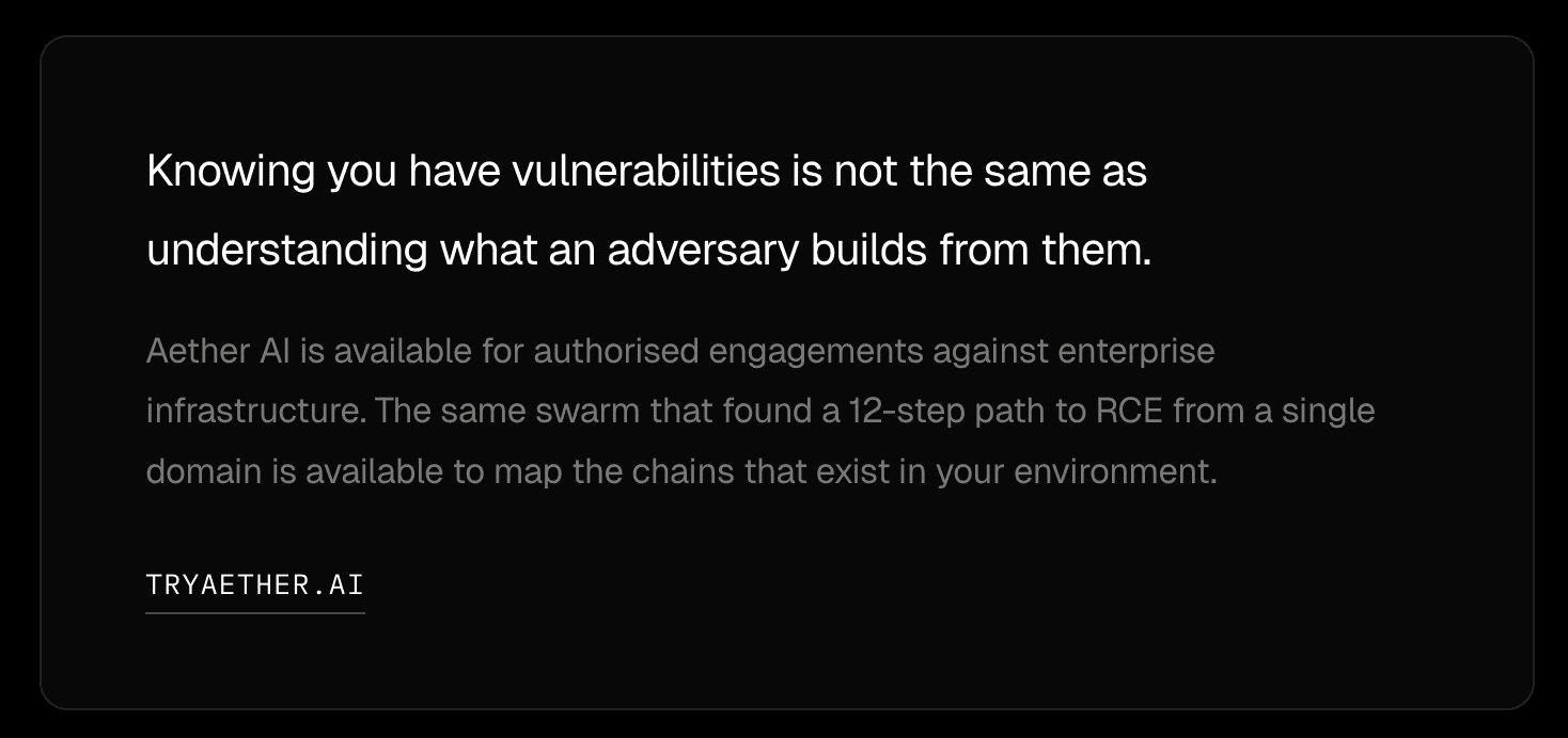 Using only a single domain as input scope, Aether AI's swarm ran for 87 hours and 11 seconds, exploring hundreds of branches simultaneously, and found the path that mattered. That is, 12 steps, starting from nothing, ending at full remote code execution.