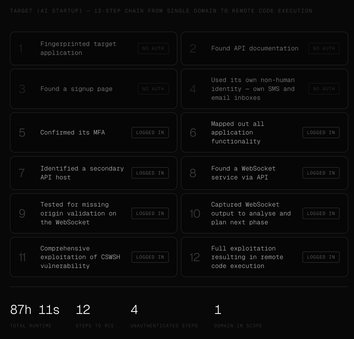 Steps one through four happened without any authentication at all; from step five onwards, the agents were operating as a logged-in user who had created their own account through the application's own signup flow, which meant the entire post-authentication attack surface - the secondary API host, the WebSocket service, the missing origin validation - was reachable in a way that a test starting from a provided test account might never have explored with the same lateral breadth.