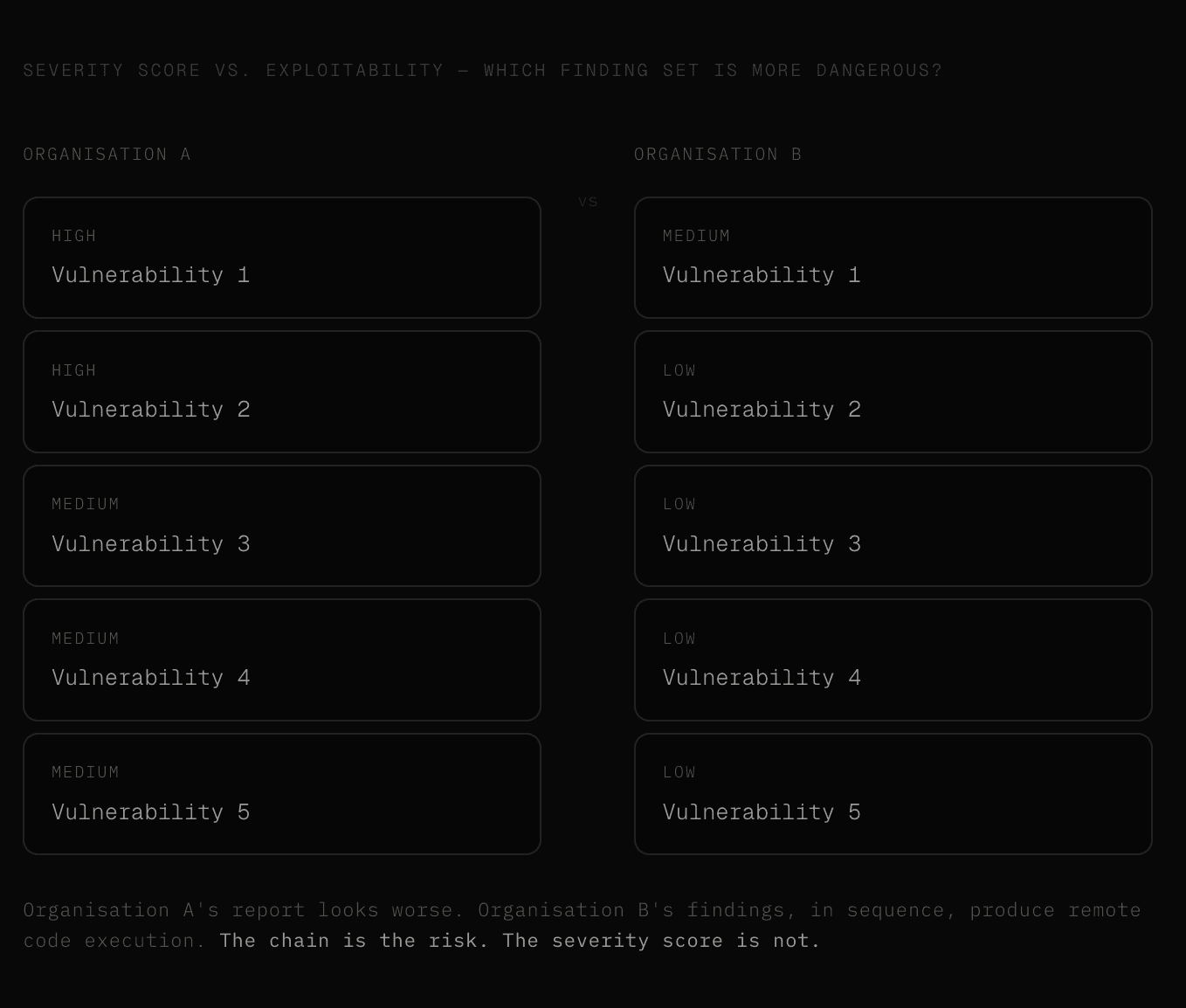 Each of those findings, reported in isolation, might be a medium or a low, while together, they are a complete compromise path, and a report sorted by CVSS score will bury the connection between them under dozens of unrelated findings of higher individual severity.